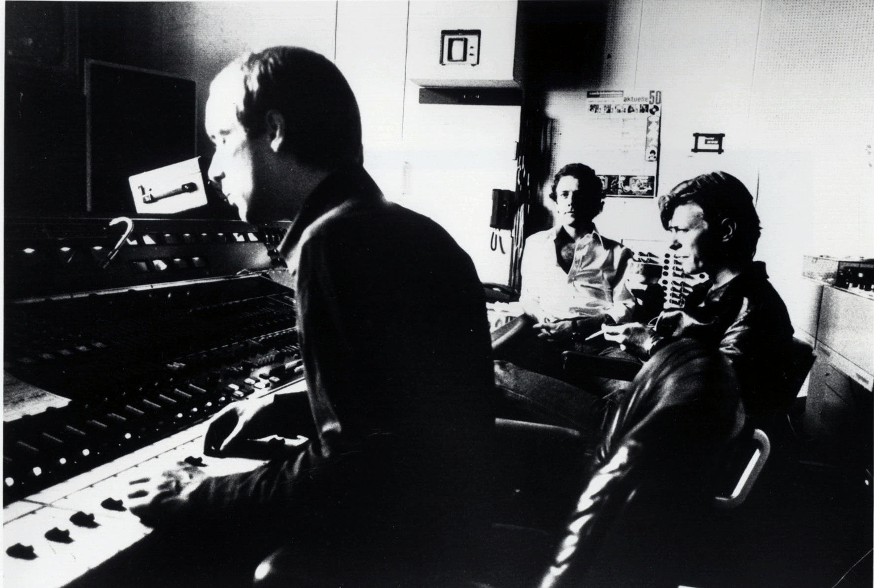 Brian Eno, Robert Fripp und David Bowie bei den Aufnahmen zu Heroes, Foto via Pinterest